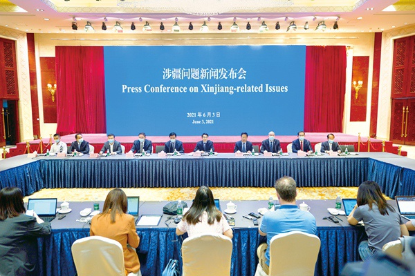 一段时间以来,西方少数国家无端指责新疆存在“强迫劳动”,抛出相关法案,对新疆棉纺织业等发起制裁。反外国制裁法的制定为今后国家行政执法和司法机关实施反制裁措施,提供了国家立法层面的有力保障。图为6月3日,新疆维吾尔自治区召开涉疆问题新闻发布会,邀请在受制裁公司工作的艾克拜尔·吐鲁洪介绍真实情况。新华社记者 邢广利 摄