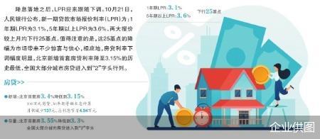降息落地之后,LPR迎来跟随下调。10月21日,人民银行公布,新一期贷款市场报价利率(LPR)为:1年期LPR为3.1%,5年期以上LPR为3.6%。两大报价较上月均下行25基点。值得注意的是,这25基点的降幅为市场带来不少惊喜与信心,相应地,房贷利率下调幅度明显,北京新增首套房贷利率降至3.15%的历史最低,全国大部分城市房贷进入到“2”字头行列。